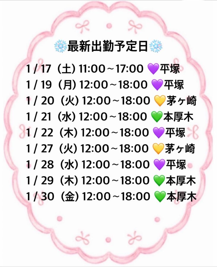 | 2026/01/17(土) | 平塚 11:00~17:00満了 |