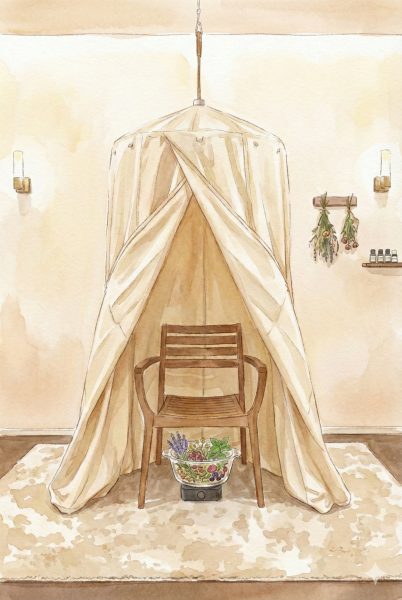 マッサージの前に椅子に座って頂き、ハーブの蒸気に20〜30分包まれるとことで体はポカポカに🌿