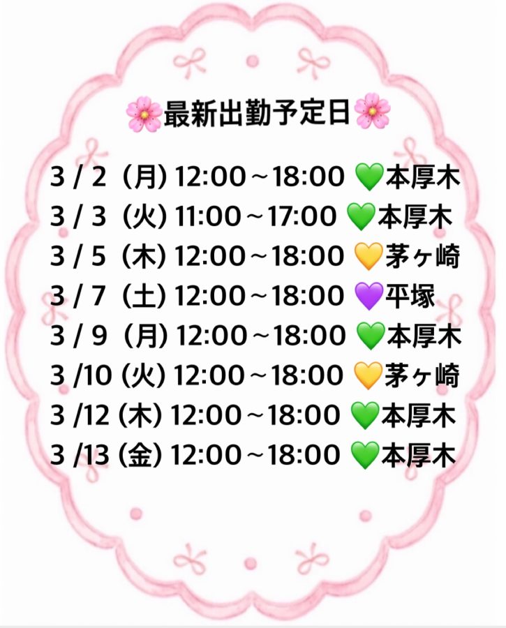 | 2026/03/03(火) | 本厚木 11:00~17:00 |